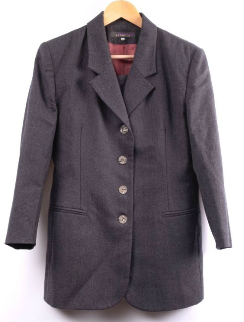 Liberty. A 1980s lady's two piece grey wool suit, comprising a single breasted jacket, size 10 and matching pencil skirt, size 12.
