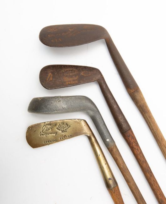 A group of four hickory shaft golf clubs, comprising a Percy Baxter Nilblick, a J Cochrane & Co Special Mashie , a brass head Glasgow Golf Company Special Putter and a J D Higgs iron ( 4)