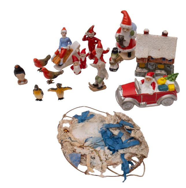 A collection of late 19th/ early 20th century Continental bisque Christmas cake decorations, including Father Christmas, and Elf and related pieces.