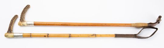 An Edwardian silver mounted antler handle riding crop, maker Swaine & Co , London, the ferrule inscribed 'O R Edwards. Farnock, 1905' on a malacca shaft, 72cm, together with another similar silver plate mounted riding crop 64cm long (2)