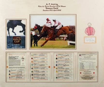 Horse Racing. Sir Tony McCoy framed autograph and Gold Cup 2002 programme titled 'A P Mc Coy Rides his record breaking 289th Winner 'Bounce Back' Sandown April 27th 2002' with photograph and signatures of other jockeys in the Gold Cup Steeplechase, framed and glazed, 66 x 78cm.