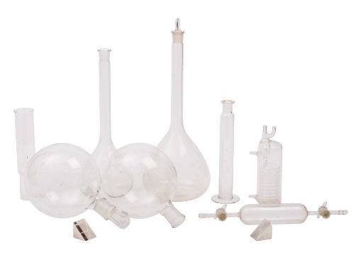 A collection of various laboratory glassware, including a Volumetric flask, a round bottom flask, condenser etc.