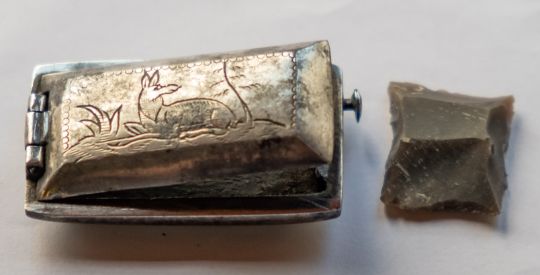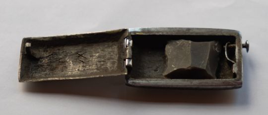 An 18th century cut steel pocket tinder box, of rectangular form, slightly rounded long sides used as a striker, decorated with a dog lying down, 4.5cm x 2.6cm.Note: J. Caspall, Fire & Light in the Home pre-1820 (2000), p. 24, Figure 21, where it is described as English. Compare the 1926 Bryant & May Museum Catalogue, which features an almost identical example [Number 703] with the lid chased with a hart. The explanatory note [p. 48] identifies the boxes as 'all Western European...Most are probably French or German, but some are English.' Many are decorated with representations of game animals or sporting scenes, 'showing they were used chiefly by sportsmen in the field...'