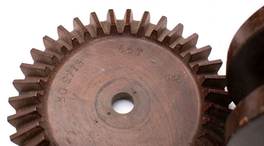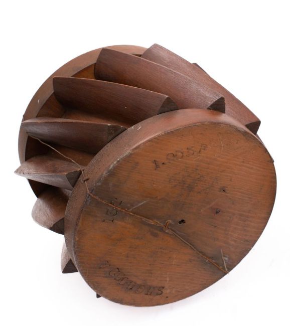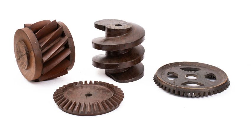 Bodley Foundry, Exeter. A collection of four large wooden gear patterns, comprising two bevel gears and two worm gears, each stamped with factory pattern number and sizes (4)