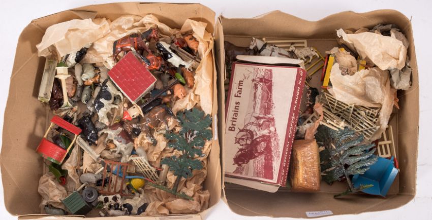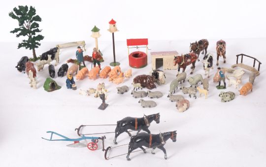 Britains Farm set, a good comprehensive collection of painted figures and animals, mainly by Britains to include boxed No.6F General Purpose Plough, farmyard workers, buildings and hedges
