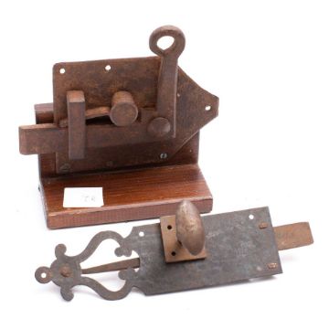 A large iron spring loaded door latch, 18th/19th century. mounted on a later wooden stand, 21cm high, together with a 19th century iron and steel spring loaded door latch 28cm long 92)