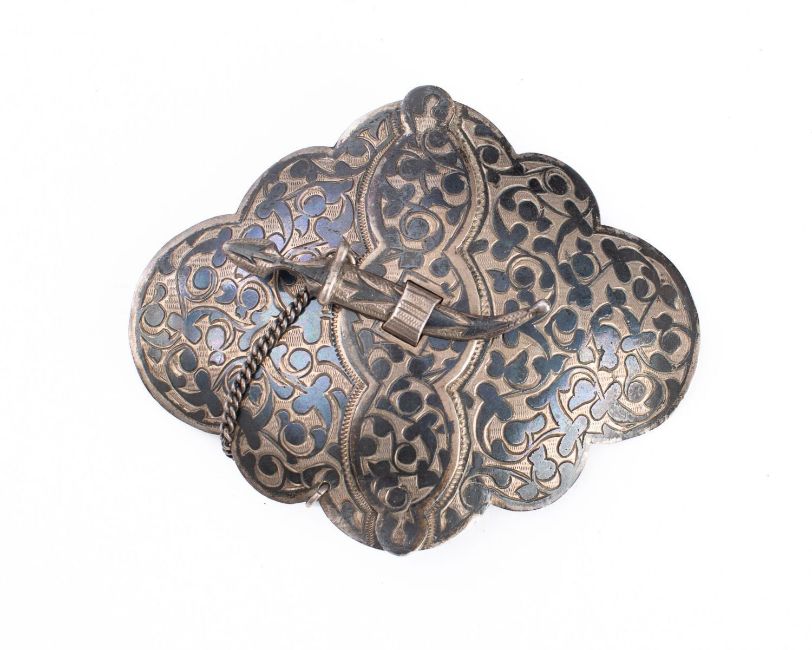 A late 19th/early 20th century Middle Eastern silver niello work waist belt clasp, the two scalloped and floral decorated sections held together by a khanjali shaped pin on safety chain.
