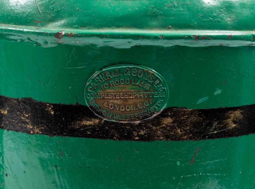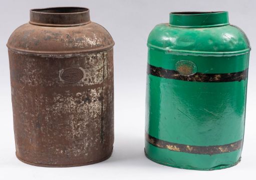 A pair of late 19th/early 20th century tin tea canisters or storage containers, maker Parnall & Sons Ltd, Bristol, 35cm high (missing covers, dented and one overpainted) (2)