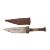 A small Indo-Persian knife, the short broad blade with single fuller over a brass hilt with horn brass banded grip, in a worked brown leather scabbard, blade length 13cm.