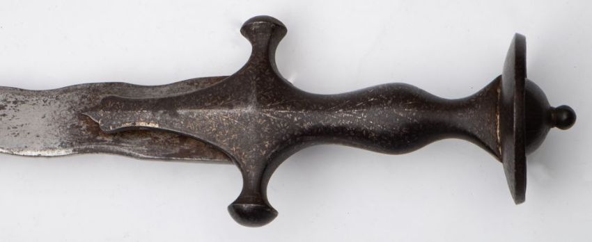 A 19th-century Indian Tulwar, the curved waved single-edged blade over traditional form iron hilt with silver koftgari flower decoration, with a red velvet covered scabbard, blade length 73.5cm.