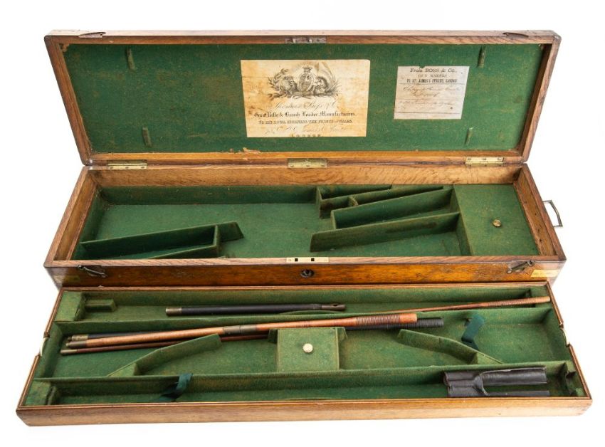 An oak and brass mounted two gun case, bearing labels to interior for Thomas Boss & Co, London and one other 'From Boss & Co' , the fitted interior with top drop in tray for 30 inch barrels, over lower compartment fitted for two stocks, the case 87 x 13.5 x 25cm