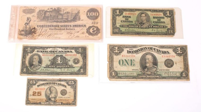 A Confederate States of America $100 bill, Richmond May 8th 1862; together with four Canadian dollar banknotes.