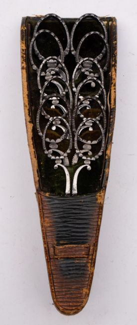 A cased set of six Georgian steel graduated scissors, maker Thornhill, retailed by J C Vickery, Regent Street, London, each with bright cut decoration in a green moroccan leather case, the case 19cm long