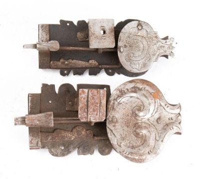 Two 17th/18th century steel locks: both with scrollwork decoration to backplates, 26cm & 25cm (2)
