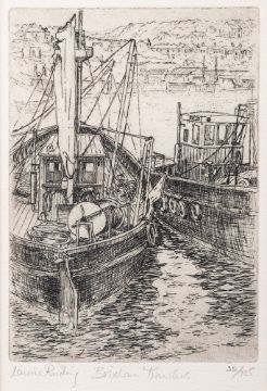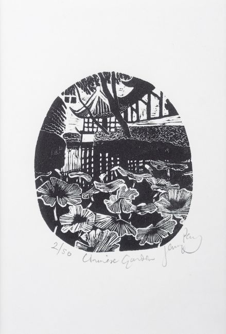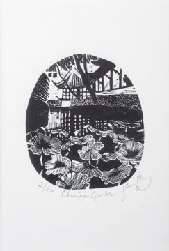 Jenny Pery (British, Contemporary School)Three Chinese viewseach signed and inscribedwoodcutsthe largest 14 x 16cm (sight); together with another woodcut, the Great Wall, indistinctly signed M... Meller; and a signed etching by Laurie Rudling, Brixham Trawlers (5)
