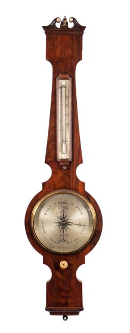 Archer Hackney, a mahogany wheel barometer, the eight-inch silvered dial with usual barometer markings and engraved with the name Archer, Hackney, the tapered mahogany case having a scroll-top pediment and with a thermometer set within the trunk, height 101cm
