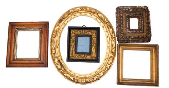 A carved and giltwood oval picture or mirror frame, 18th century; with stylised foliage in high relief; 69 x 58cm together with a gilt gesso and ebonised frame with figural decoration, 31 x 28 and three further frames. [5]