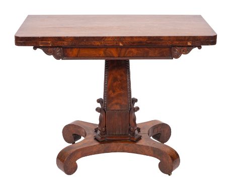 A George IV mahogany tea table, circa 1825; the hinged top revolving on the frieze block with a well within; the pedestal shaft descending past scrolled bearers on a reeded block to the quatreform base; the downscrolled feet with castors; 73cm high, 91cm wide, 46cm deep (closed)