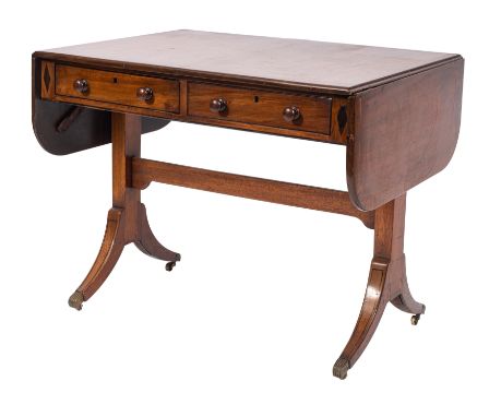 A Regency mahogany and inlaid sofa table, bordered with boxwood and ebony lines, the crossbanded hinged top with rounded corners, fitted with two frieze drawers, flanked by inlaid lozenge-shaped motifs, on solid standard and dual splayed end supports, united by a plain stretcher, terminating in reeded brass cappings and castors - the top 66cm x 141cm (2ft 2ins x 4ft 7 1/2ins) extended.