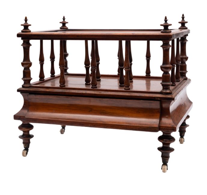 A Victorian walnut Canterbury, circa 1860; the openwork superstructure with turned spindle supports; the cavetto moulded base with a drawer to the front; on turned legs to ceramic castors; 50cm high, 57cm wide, 38cm deep