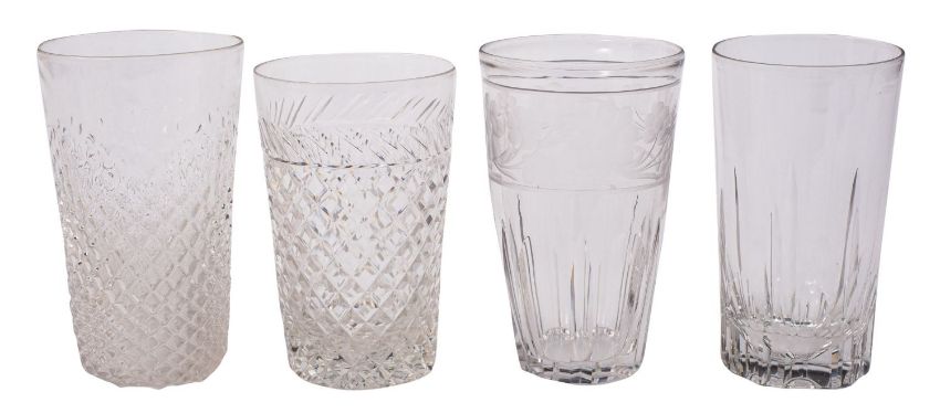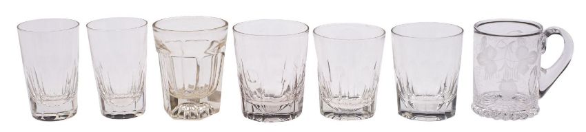 A mixed group of drinking glasses, comprising an ale mug engraved with hops and barley, a small trumpet shaped wine glass engraved with a hunting scene, a champagne flute, a small trumpet shaped glass with fold over foot, two coloured glass rummers, six various tumblers [one with lemon squeezer base] and four various beer glasses.