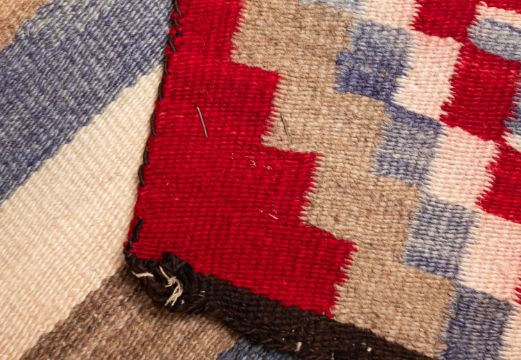 A Navajo flatweave rug, the serrated lozenge and chevron field in orange and vibrant colours, 213cm x 145cm and another Navajo rug, the striped field in wine, powder blue, mushroom and ivory colours and with a central stepped lozenge medallion, 166cm x 148cm (2).