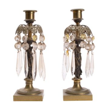 A pair of Regency gilt bronze and glass hung figural lustre candlesticks, circa 1815; the engine milled sockets above downturned stems with anthemia supporting faceted glass beads and pendants; around standing and draped maidens, on engine milled circular socles to square bases; 26cm high