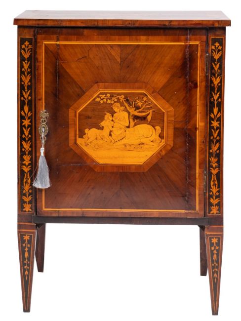An Italian walnut, tulipwood and marquetry comodino, in the manner of Giuseppe Maggiolini, circa 1790; the quarter veneered top with a central musical trophy within a lozenge reserve and concentric borders; the door with a depiction of a centauride with a suckling beneath a tree, within an octagonal reserve; flanked to each side by stylised foliate inlaid panel pilasters; the sides with conforming inlay; on conforming, straight, tapered legs; 79cm high, 56cm wide, 38cm deep