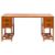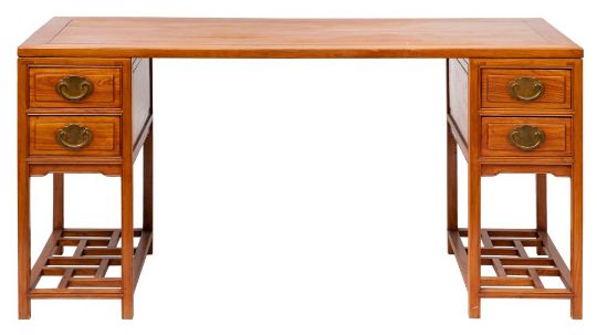 A Chinese stained hardwood desk, later 20th century; the cleated rectangular top on pedestals each with two drawers above open galleries; with geometrically arranged openwork undertiers; 81cm high, 168cm wide, 68cm deep
