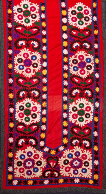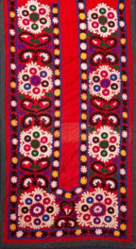 A North East Persian silk bed cover embroidered in the form of a prayer arch with panels of stylised flowers and foliage on a red ground, 200 x 110cm.
