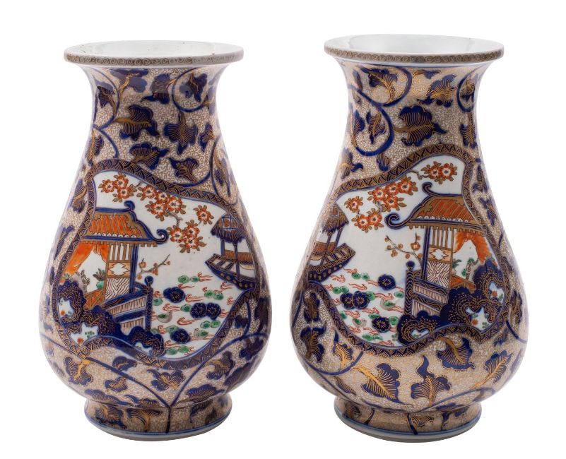 A pair of Japanese Imari vases of inverted pear shape painted with panels of lake side scenes reserved on a ground of scrolling stems of foliage, seal marks, circa 1900, 31cm.