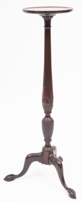 A carved mahogany torchere stand in the Hepplewhite style, 20th century; the circular top on reeded column headed with foliage and carved with wheat ears; with tripod splayed legs with claw and ball feet; 107cm high, 30cm diameter