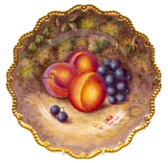 A Royal Worcester fruit painted plate with gilt gadrooned rim, painted by Harry Ayrton with peaches, grapes and gooseberries on a mossy background, signed, black printed mark with date code for 1950, 22.5cm
