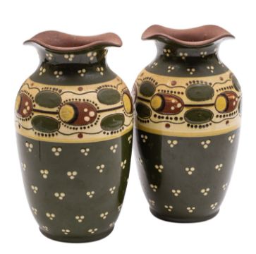 A pair of Aller Vale vases of oviform with wavy rim, the exterior slip and sgraffito decorated with a band of stylised Art Nouveau blooms on a green ground, impressed marks and incised N.1, 22cm high.