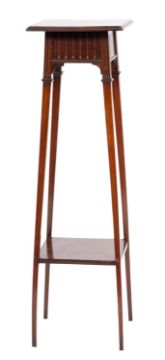 An Edwardian mahogany torchere stand; the rectangular top with moulded edge, above a channeled frieze, on square tapering legs; 104cm high, 31cm wide, 31cm deep