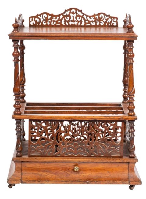 A Victorian walnut Canterbury whatnot; with a three quarter pierced fret gallery and bell shaped finials, on turned and spirally fluted baluster uprights, the three division base with pierced fret foliate scroll panels, and cushion frieze drawer below, on castors; 86cm high, 61cm wide, 40cm deep