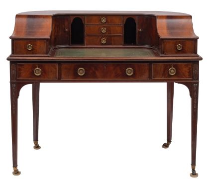 An Edwardian mahogany Carlton House writing desk, the curved superstructure fitted with small drawers, pigeon holes and twin enclosed cupboards, the centre inset with a panel of tooled green leather, containing three frieze drawers, on square tapered legs with ribbon tied pendant husk ornament headed with paterae, terminating in brass cappings and castors, 101cm high, 122cm wide, 64cm deep.