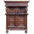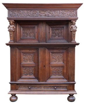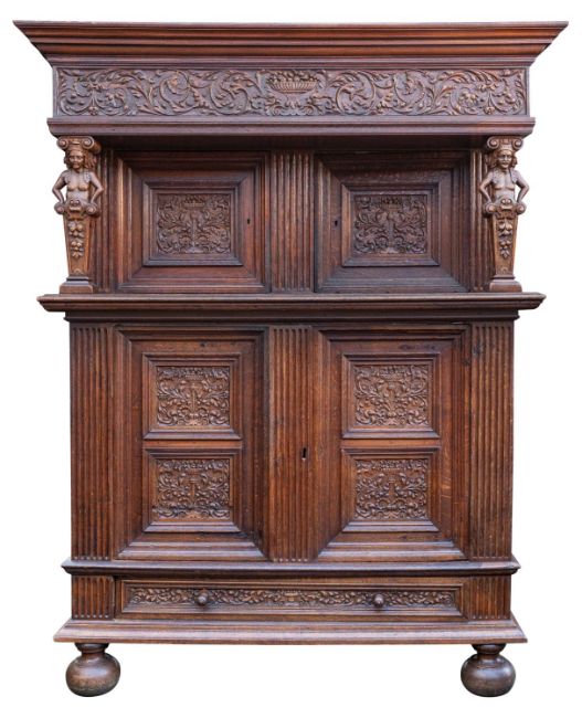 A Flemish oak court cupboard in 17th century style, 19th century; with double ogee and stepped cornice, on a canopy with recessed relief carved frieze of scrolling foliate grotesques flanking a fruit filled tazza; on twin term supports before two set back conforming carved panel doors with fluted interstertials; the lower section with two further conforming panel doors and interstertials; above a long drawer; on frontal bun feet; 212cm high, 165cm wide, 68cm deep