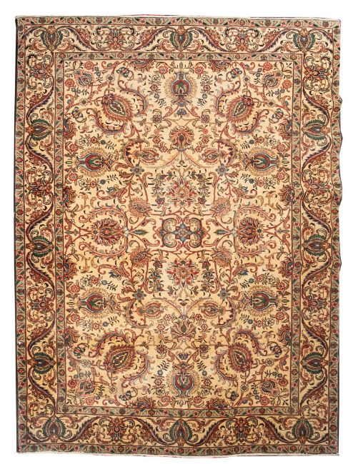 A Tabriz carpet, the ivory field with an all over design of palmettes and scrolling floral foliage, enclosed by a similar border, 293cm x 203cm