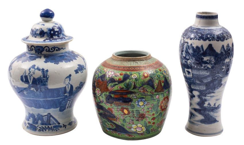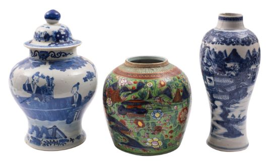 Three pieces of Chinese porcelain, Qing dynasty comprising a baluster jar and cover painted with three figures at a table on a terrace, double circles mark, 27cm [hair crack]; a baluster vase, 27cm [cracked]; and a globular jar with clobbered decoration, 18cm [3].