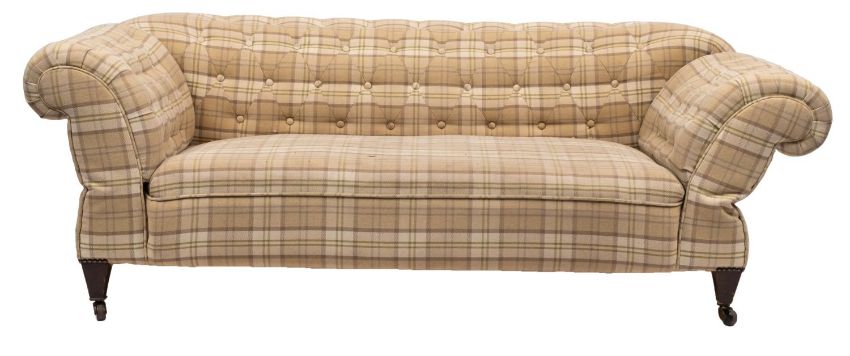 A late Victorian / Edwardian button re-upholstered drop end Chesterfield sofa, 20th century; with outscrolled back and arms, on short legs with ceramic castors; 66cm high, 182cm wide.Please note: one rear leg is stamped E987.