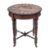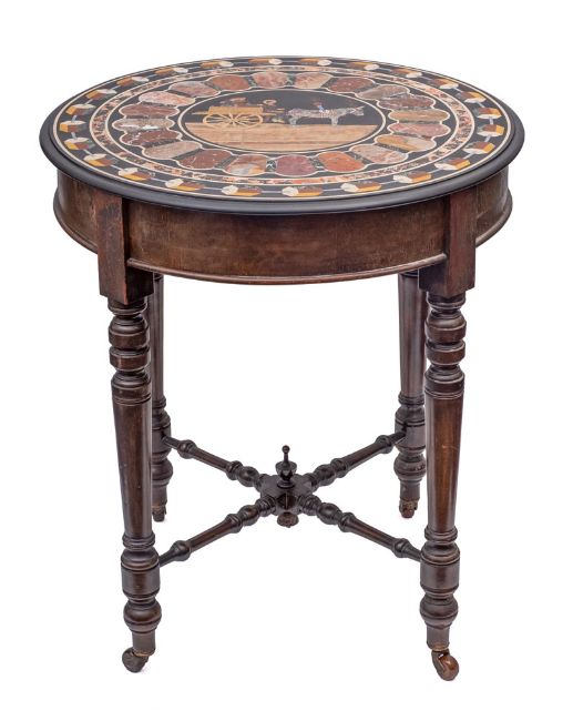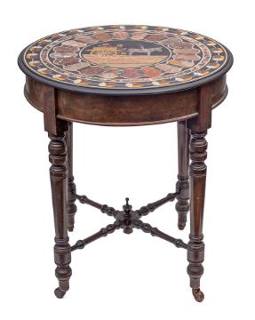 An Italian, pietra dura topped walnut circular occasional table, probably Rome, late 19th century; the central tondo with a depiction of figures in a cart drawn by a donkey on a ground of Tuscan alabaster; within concentric borders, bands and geometric motifs of sample hardstones including marmo rosso Levanto, Italian green serpentine, marmo Siena, marmo rosso antico and malachite, all in a black stone ground; with ovolo moulded edge; the veneered base with four ring and knop turned legs with ceramic stretchers, united by cruciform stretchers with an urn finial; 77cm high, 68cm diameterProvenance: Gifted to the great grandparents of the vendor in Sicily, in the late 19th century.