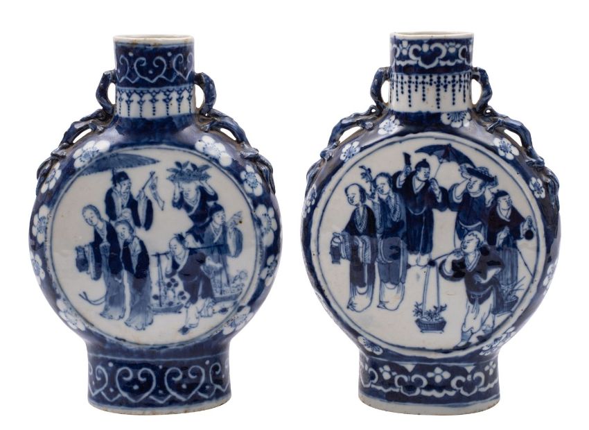 A pair of Chinese blue and white moon flasks with chilong handles, painted with processional scenes on prunus grounds, late Qing dynasty, 22cm [one with small rim chip].
