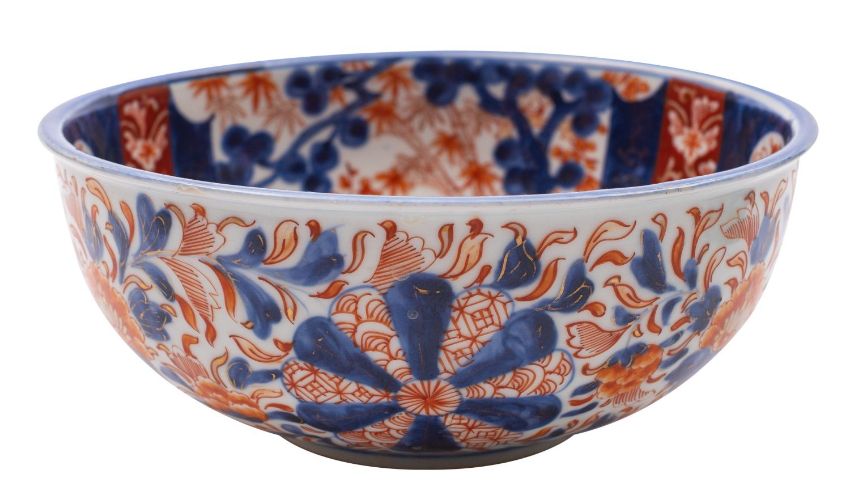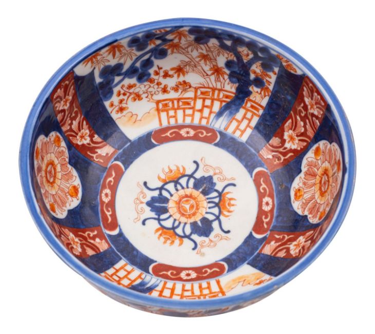 A Japanese Fukagawa Imari bowl painted with panels of bamboo and prunus beyond lattice fences, the exterior with flowers, foliage and mon, Koransha mark, early 20th century, 21.5cm [tiny chip to rim].