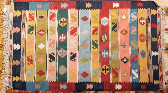A Kelim, with multiple horizontal bands with hexagonal, hooked and lozenge medallions in various colours, 175cm x 100cm.
