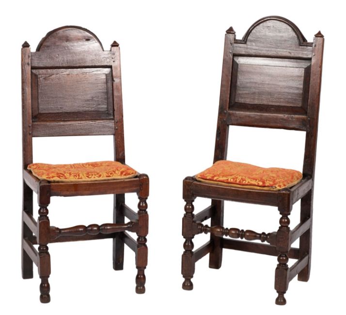 A matched pair of late 17th-century oak Cheshire single chairs; the fielded panel backs with domed arch crestings, with solid seats, each with loose cushion, on turned and block stretchered legs united by turned front stretchers; the chairs respectively 105cm and 110cm high, 44cm and 45cm wide