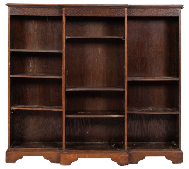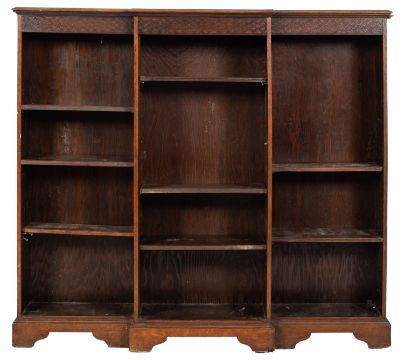 An Edwardian oak low open breakfront bookcase; with a moulded top and blind fret carved geometric frieze, fitted with adjustable shelves, on bracket feet; 122cm high, 138cm wide, 30cm deep