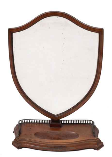 A late Victorian mahogany dressing table mirror, circa 1900; the adjustable shield shaped bevelled plate on a tapered stem to a shaped base, with balustraded three quarter gallery and moulded sides; 80cm high, 54cm wide