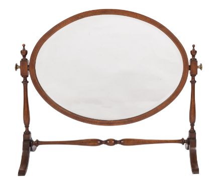 A mahogany and crossbanded oval dressing table mirror, in George III style, 19th century; the urn finials on baluster supports terminating in tresle feet, united by a straight baluster and knop stretcher; 58cm high, 69cm wide