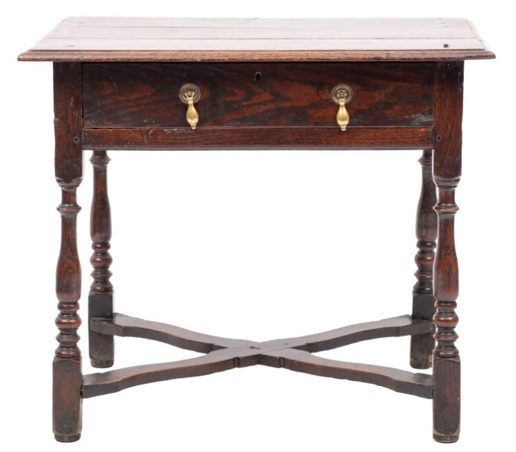 An early 18th-century oak and elm rectangular side table; with a moulded top, fitted with a single drawer, on turned baluster legs, united by a flattened shaped X-frame stretcher; 68cm high, 79cm wide, 55 deep